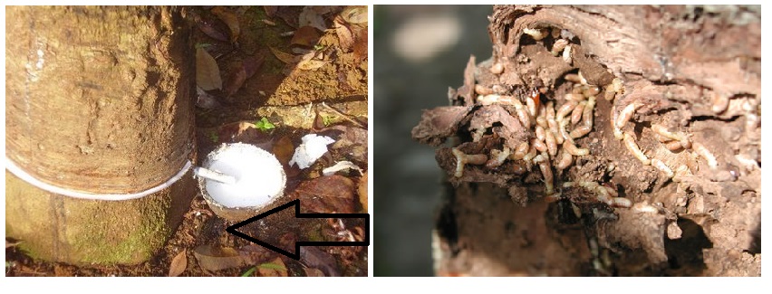 - Menggunakan larutan insektisida Granular (G) untuk disemprotkan pada bagian lubang tanam, terutamanya pada bagian lokasi endemik atau rawan rayap dan batang tanaman karet.